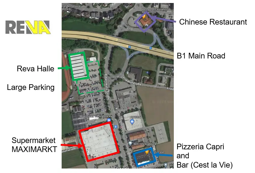In unmittelbarer Nähe von der REVA Halle findet man diverse Essensmöglichkeiten wie z.B: