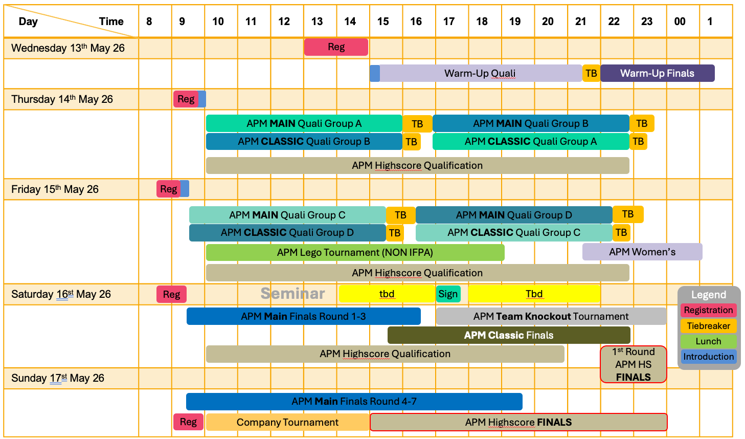 - Die Hauptqualifikation der Austrian Pinball Masters wird am selben Tag, jedoch im jeweils anderen Zeitfenster ausgetragen (z. B. Hauptqualifikation am Vormittag, anschließend Classic-Qualifikation am Nachmittag/Abend).